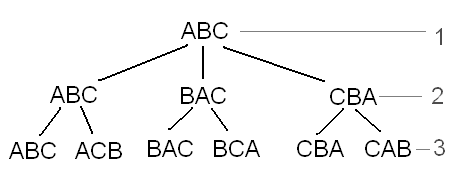 Суть идеи крайне проста. Допустим есть набор фишек из 3 штук (A, B и C). Сначала мы раскладываем все варианты, которые начинаются на A: ABC и ACB. Варианты закончились. Потом все варианты, которые начинаются с B: BAC, BCA. Далее все варианты, начинающиеся с C: CAB, CBA. Получается вот так: